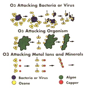 El Ozono es un gas producido a partir del oxigeno del aire y que genera oxigeno naciente. El Ozono esta formado por tres átomos de oxigeno que presentan una alta capacidad, DESINFECTANTE Y DESPARASITANTE al liberarse un átomo de Oxigeno de la molécula, con lo que se tiene una solución sumamente valiosa, de fácil y seguro manejo cuando el Ozono es disuelto en agua en forma adecuada y eficiente, (cosa que no se logra fácilmente en grandes volúmenes y con aguas difíciles ó contaminadas) y esto Sí se logra, aún cuando estas aguas no sean convenientes, por ejemplo cuando son saladas ó poco potables, convirtiéndolas en un agua más allá de solo servir para tomar y con mayor razón cuando son "BUENAS". Esto sucede cuando se realiza ó trata con la Tecnología adecuada, como la desarrollada por REALTEC con mas de 30 años de experiencia en estos campos y no con el uso de Cloro, un simple filtro, suavizador u Osmosis inversa.